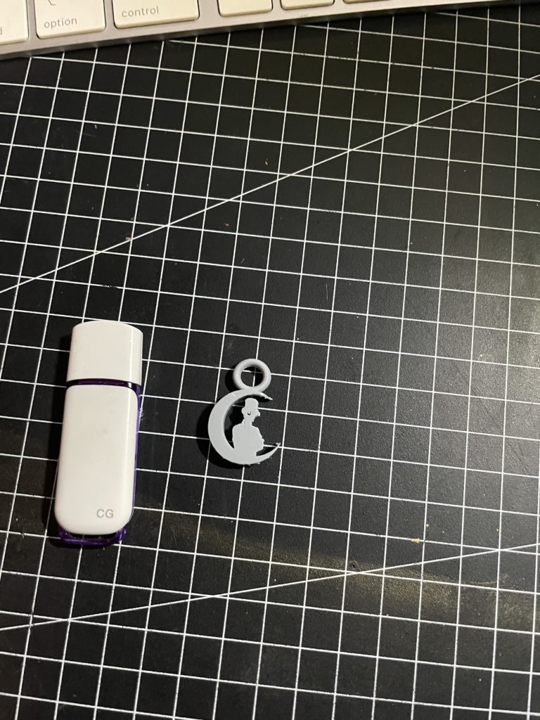 Der erste Prototyp (Anhänger alleine) war gut gedruckt. Hier einmal ein Bild mit einem USB Stick um die Größe zu verdeutlichen.