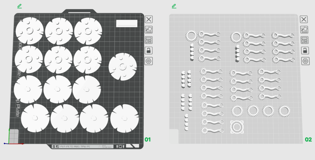 Damit wir auch genug haben hatte ich nach dem ersten Prototypen einmal alles für 7 Drucke vorbereitet und als erstes die Platte zwei mit den Kleinteilen in den Druck gegeben.