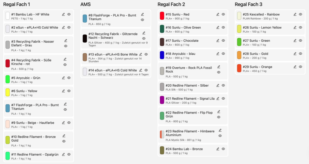 Im Ganzem habe ich mit der Software nun zwei Tage verbracht um alle Materialien, Hersteller und Spulen einzutragen. Dies erleichtert mir nun aber wirklich wesentlich meine Arbeiten da ich nie wieder, vorausgesetzt man stellt alles dahin wo es hingehört, Filamente suchen muss.