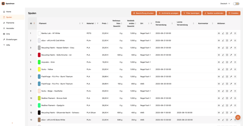 Nachdem wir nun alle Filamente angelegt haben wollte ich natürlich auch die vorhandenen Spulen eingeben mit dem Ort wo sie gelagert sind. Hier gibt es verschiedene Optionen. Ihr könnt die Orte zu erst anlegen oder Ihr macht dies bei der Spulen Erstellung. Letzteres habe ich so gemacht und konnte so einen Ort nach dem Anderen mit den entsprechenden Spulen füllen.