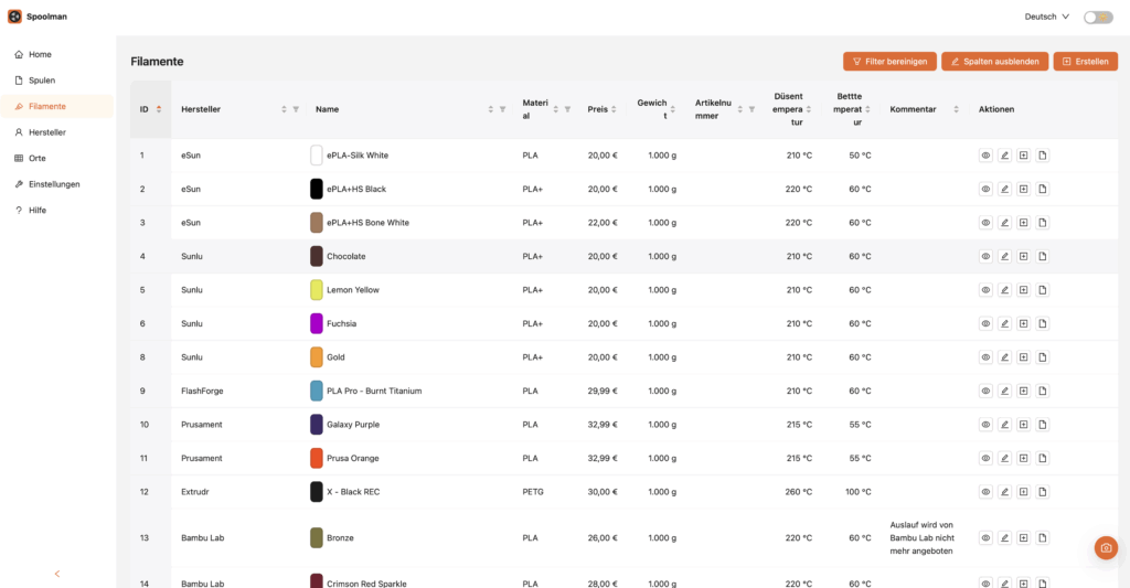 Als nächstes habe ich die entsprechenden Filamente angelegt mit Farbe etc. Hier war die externe Datenbank sehr hilfreich da die meisten Filamente hier schon vorhanden waren. Meine Liste geht mittlerweilen über mehrere Seiten und es sind auch Filamente enthalten welche wir nicht mehr da haben aber mal genutzt hatten und mal wieder nutzen wollen.
