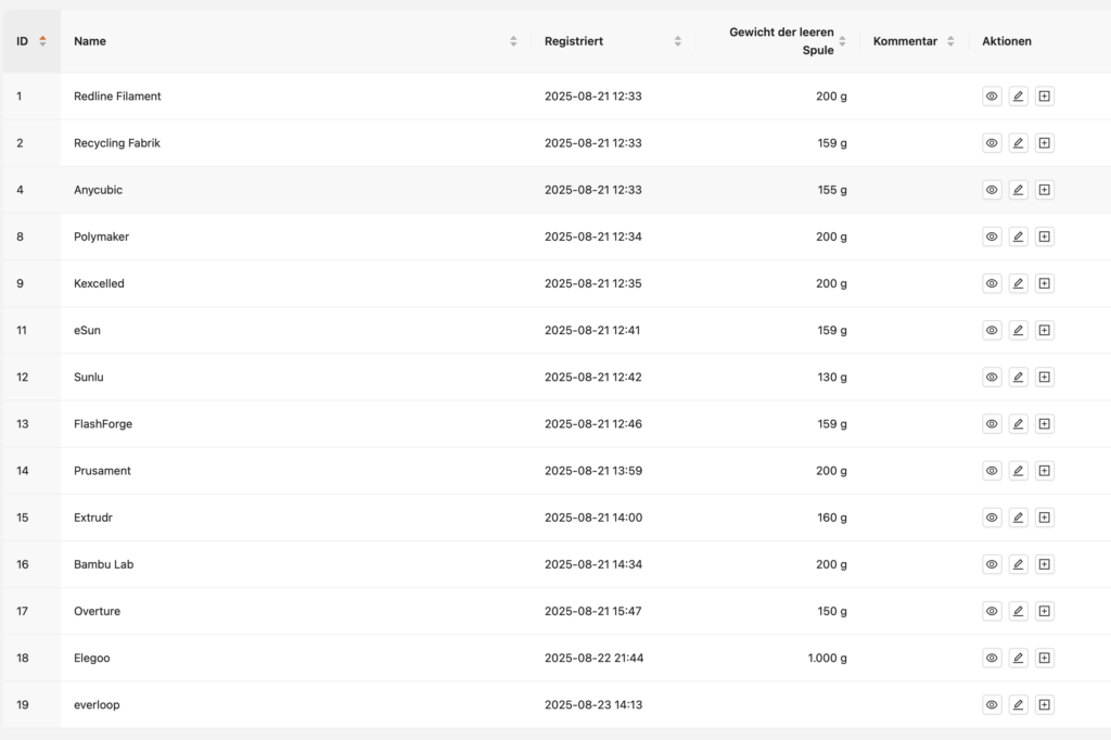 Die Leergewichte der Spulen wurden bei einigen geschätzt und wird in Zukunft noch manuell gemessen und an gepasst. Bei einigen wenigen wie Recyclingfabrik nutze ich selbstgedruckte Spulen wo ich das Gewicht kannte.