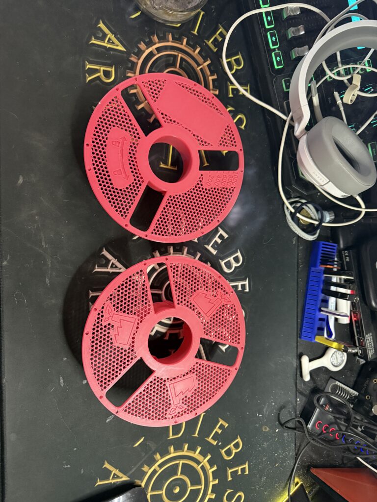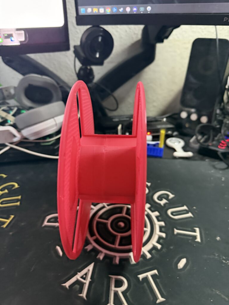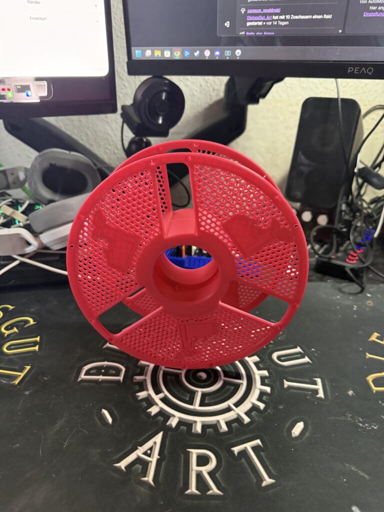 Die PLA gedruckten Spulen sind in süßer Kirsche rot gedruckt worden die PETG Rollen in grau.