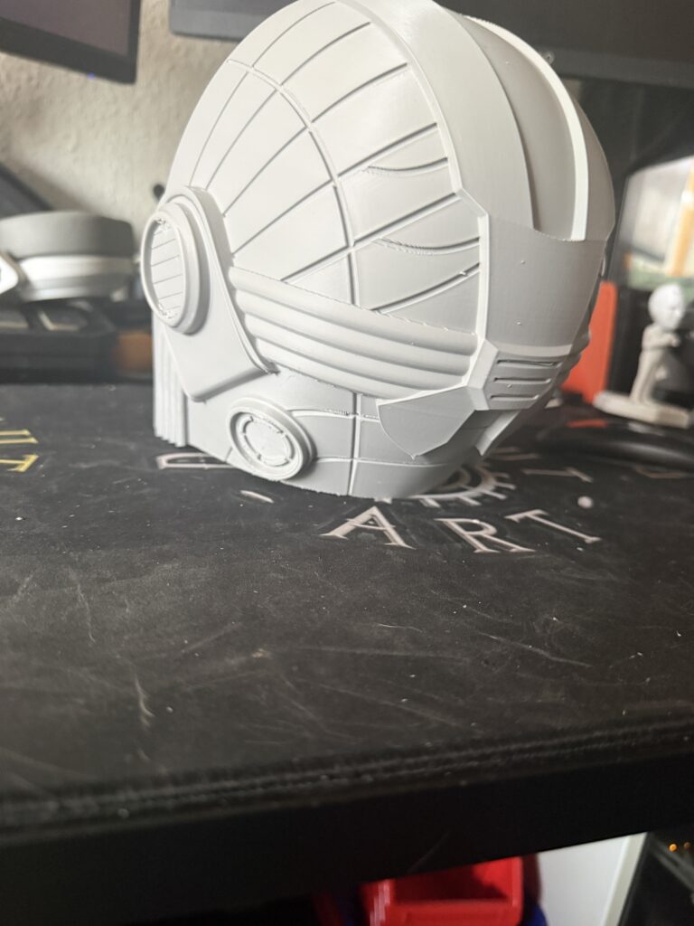 Zeit gleich druckt der P1S die Hinterseite des Helms. Dieser wird final nicht verklebt sondern ich werde da mit kleineren Cosplay Helfern arbeiten und hier Magnete verbauen, so dass der Helm sich einfach zusammen setzten lassen wird.